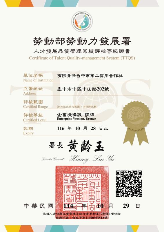 勞動部勞動力發展署推動之「人才發展品質管理系統(TTQS)」是我國唯一國家級訓練品質認證系統,培訓單位可檢測自身訓練體系、瞭解內部人才發展情形。本社於本(114)年10月接受評核,獲得銅牌肯定。