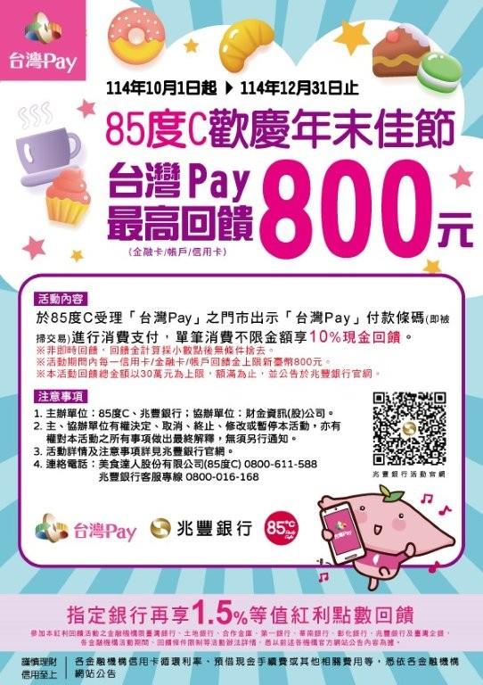 【台灣PAY優惠活動】85度C歡慶年末佳節! 台灣Pay最高回饋800元