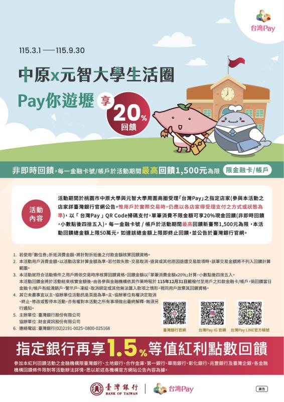 【台灣PAY優惠活動】中原x元智大學生活圈 Pay你遊壢享20%回饋
